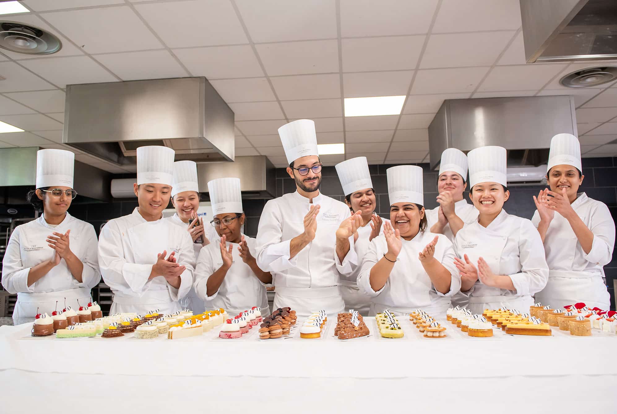 Professional uniforms and pastry kits are provided.