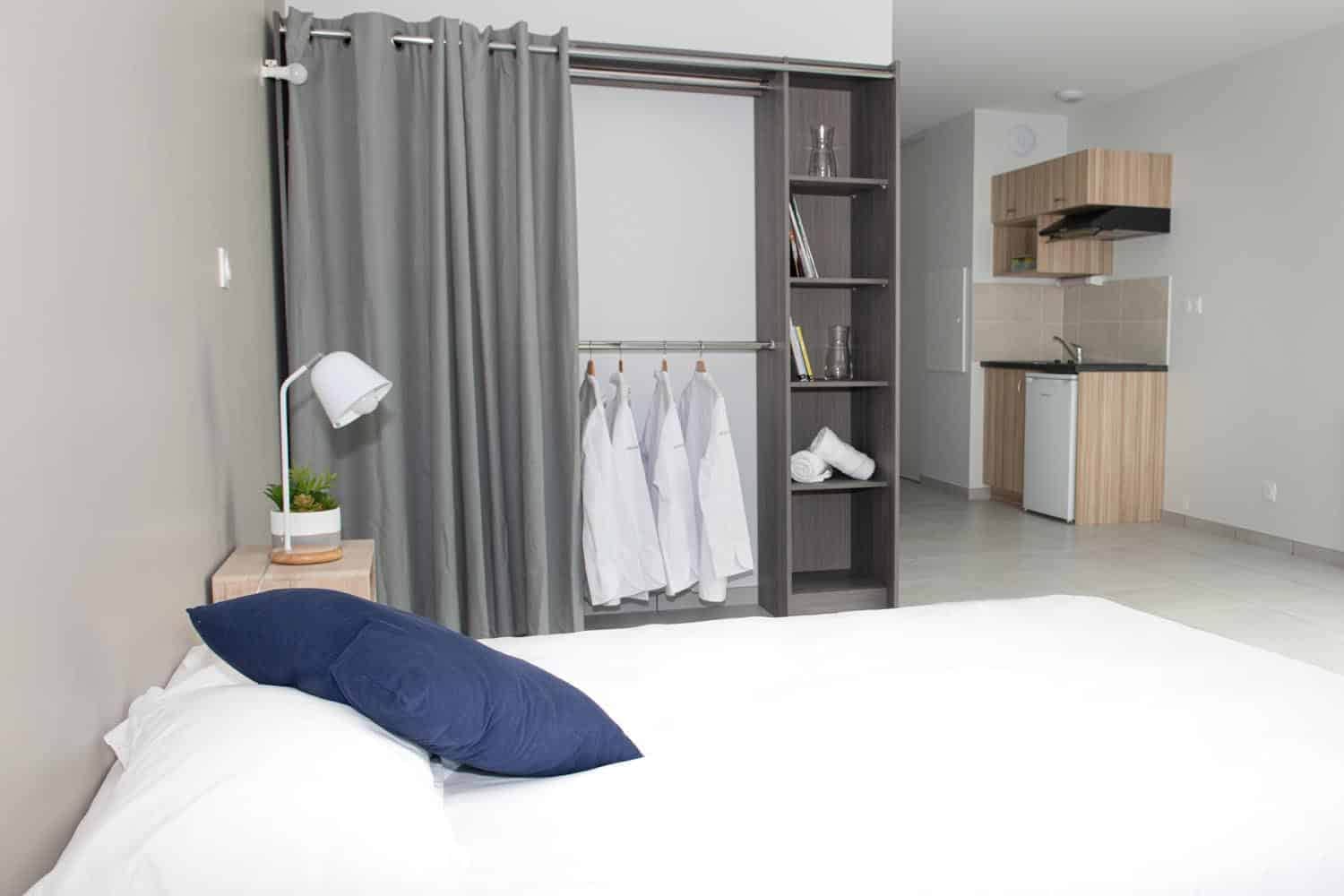 16 studios disponibles (8 de 25 m² et 8 de 30 m²), avec parking gratuit.